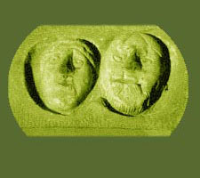 deux masques, grossièrement taillés dans un écusson, symbolisent le seigneur Roch et sa femme Léocadie.